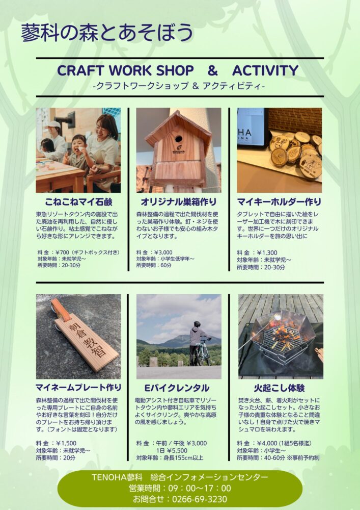 TENOHA蓼科インフォメーションセンターでは小さなお子様でもお楽しみ頂ける「こねこねマイ石鹸」、「オリジナル巣箱作り」、「オリジナルキーホルダー作り」、「オリジナルネームプレート作り」、「火起こし体験」と5種のワークショップをご用意。また、コーヒー・紅茶(それぞれホット・アイス)・信州リンゴジュースなど各種ドリンクもご準備しておりますので、軽喫茶としてもご利用頂けます。是非お気軽に足をお運び下さい!