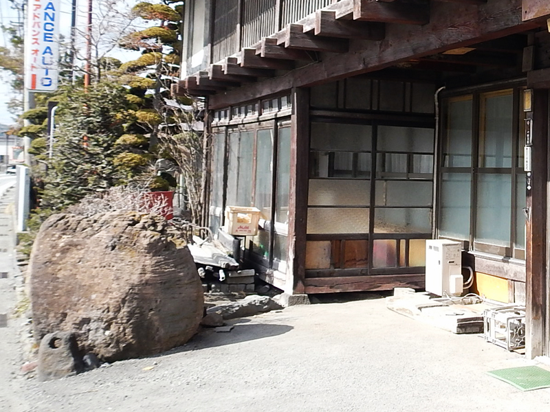 敷地入口と道路向かいの民家の軒先には、「駒つなぎ石」があります(写真左下の穴の開いた石)。