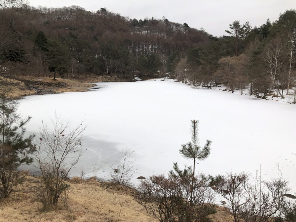 こちらはリゾートホテル中庭の「からまつ池」。結氷して雪で真っ白です。危ないので決して氷の上に乗らないようにお願いします。うっすらと凍っているだけです。