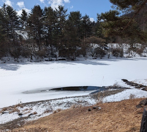 1月中旬以降、気温がマイナス10℃を下回る日が続いており、その影響で、蓼科東急ホテル前の「からまつ池」では氷の厚みが増しております。